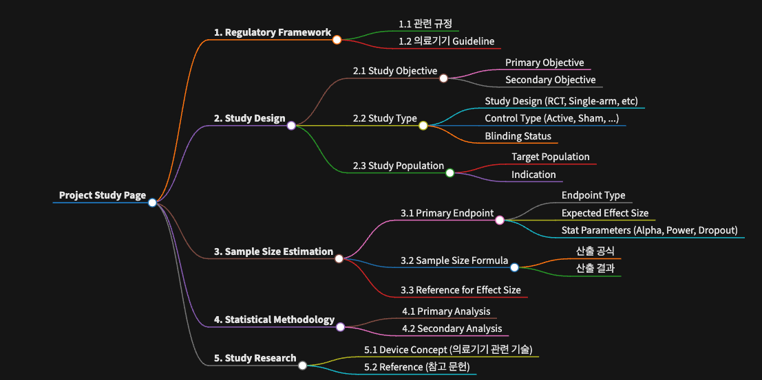 올해 5월 중순에 신입 팀원이 BSA(Biostatistician Associate) 으로 합류하였고 저는 BSM (Biostatistician Manager)으로써 함께 의료기기 임상통계 업무를 잘 해나갈 구조를 만들어가고 있습니다. 회사에서 맡은 의료기기 임상시험과 관련된 통계 업무를 잘 하기 위해서는 통계 분석을 위한 코딩 기술과 같은 통계 역량과 함께 해당 임상 연구에 대해 잘 이해하는 것도 중요합니다. 의료기기 임상 통계 업무를 체계적으로 하기 위해 매 프로젝트 마다 작성하는 임상 Project Study page 를 고안하게 되었습니다.